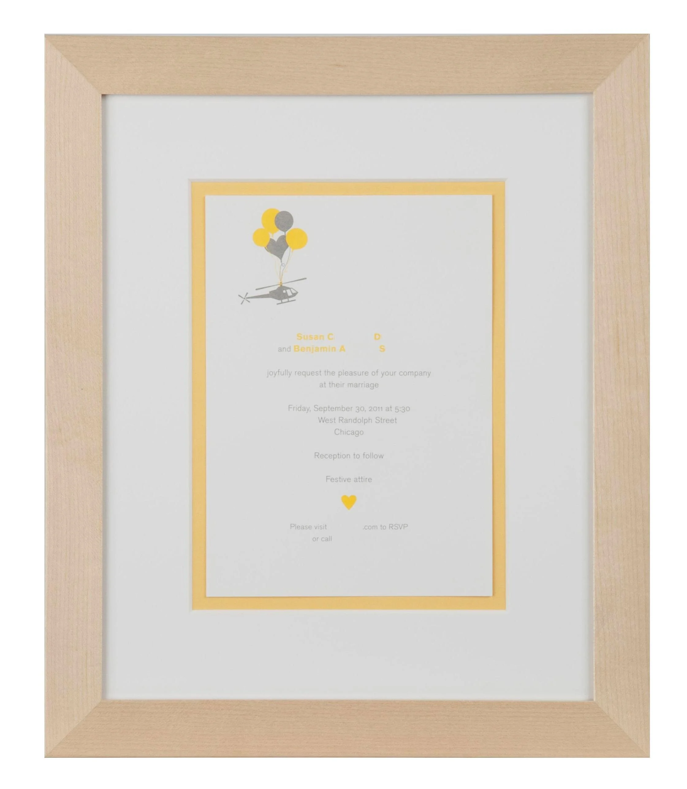 When working with your framer, keep in mind the happy couple's style. Do they prefer fun and funky? Traditional? Ornate? We suggest keeping it clean and simple if you aren't sure. Maple and white frames are good, neutral choices for these occasions.