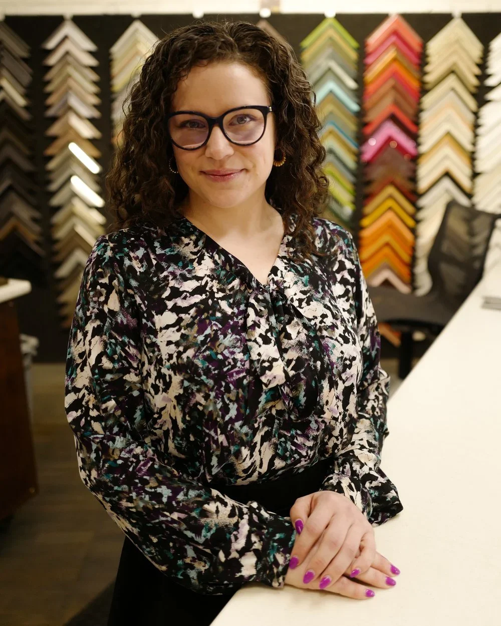 Rosa loves framing sentimental pieces with customers, whether they are photographs of special moments or items that hold significance and can preserve a moment in time. In fact, one of her most favorite things she's ever framed is a super realistic pastel portrait of her cat, Claudius, drawn by a friend. It lives in a gold frame, matted with an oval opening and gold painted bevel, and is the star of her living room.